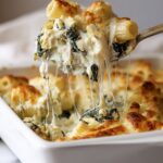 A creamy and delicious Spinach and Artichoke Pasta Bake featuring rigatoni pasta tossed in a cheesy spinach and artichoke sauce, baked to golden perfection with mozzarella and pecorino cheese on top. This hearty dish combines fresh vegetables and rich dairy for a comforting meal perfect for dinner.