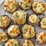 Delicious spinach dip stuffed mushrooms featuring a creamy blend of cream cheese, sour cream, Parmesan, and fresh spinach, baked to golden perfection and topped with mozzarella cheese. A perfect appetizer or snack for any occasion.