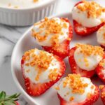 Delight in these deviled strawberries, a unique and elegant twist on the classic deviled egg concept. Fresh, halved strawberries are filled with a smooth, creamy sweetened cream cheese filling and topped with a crunchy golden Oreo and strawberry gelatin crumb for a perfect balance of texture and flavor. Ideal for parties, brunches, or as a refreshing dessert, this recipe is quick to prepare and visually stunning.
