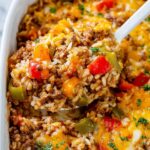 - Assemble Casserole: In a baking dish, spread half of the meat mixture. Layer with half of the cooked brown rice, diced bell peppers, diced yellow onion, and half of the shredded cheddar cheese. Repeat the layers once more.