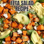 A vibrant and nutritious Sweet Potato Salad featuring roasted sweet potatoes, fresh arugula, creamy avocado, tangy tahini dressing, and crunchy toasted pepitas, topped with crumbled feta cheese for a perfect balance of flavors and textures.