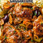 - Finish and serve: Remove the skillet from the oven. Top with pitted Kalamata olives and garnish with chopped fresh parsley. Serve the chicken cacciatore hot over noodles, rice, or polenta.