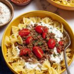 This Turkish Pasta Recipe features tender farfalle pasta combined with a flavorful ground beef sauce, a creamy garlic yogurt topping, and a spicy buttery drizzle, garnished with fresh herbs and cherry tomatoes for a quick and satisfying weeknight dinner.