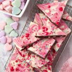 Delight in this festive Valentine’s Day Chocolate Bark featuring layers of dark chocolate, white chocolate, and pink candy melts swirled together with colorful Valentine’s Day candy and sprinkles, perfect for a sweet holiday treat.