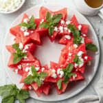 - Arrange the wreath: Place watermelon triangles around the perimeter of a large platter, interspersing fresh mint leaves as you go. Add the star-shaped pieces on top.