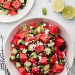 A refreshing and vibrant watermelon salad featuring juicy cubed watermelon, crisp seedless English cucumber, fresh mint, and tangy crumbled feta cheese, all tossed in a zesty lime and olive oil dressing. Perfect as a light side dish for summer meals.